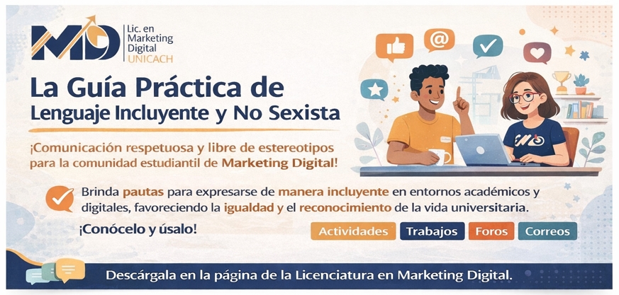 | La Guía Práctica de Lenguaje Incluyente y No Sexista de la UNICACH es un recurso orientado a las y los estudiantes de la Licenciatura en Marketing Digital, que promueve una comunicación respetuosa, clara y libre de estereotipos en entornos académicos y digitales. Su propósito es brindar pautas sencillas para redactar y expresarse de manera incluyente en actividades, trabajos, foros, correos y contenidos, favoreciendo la igualdad, la convivencia y el reconocimiento de la diversidad dentro de la vida universitaria. |